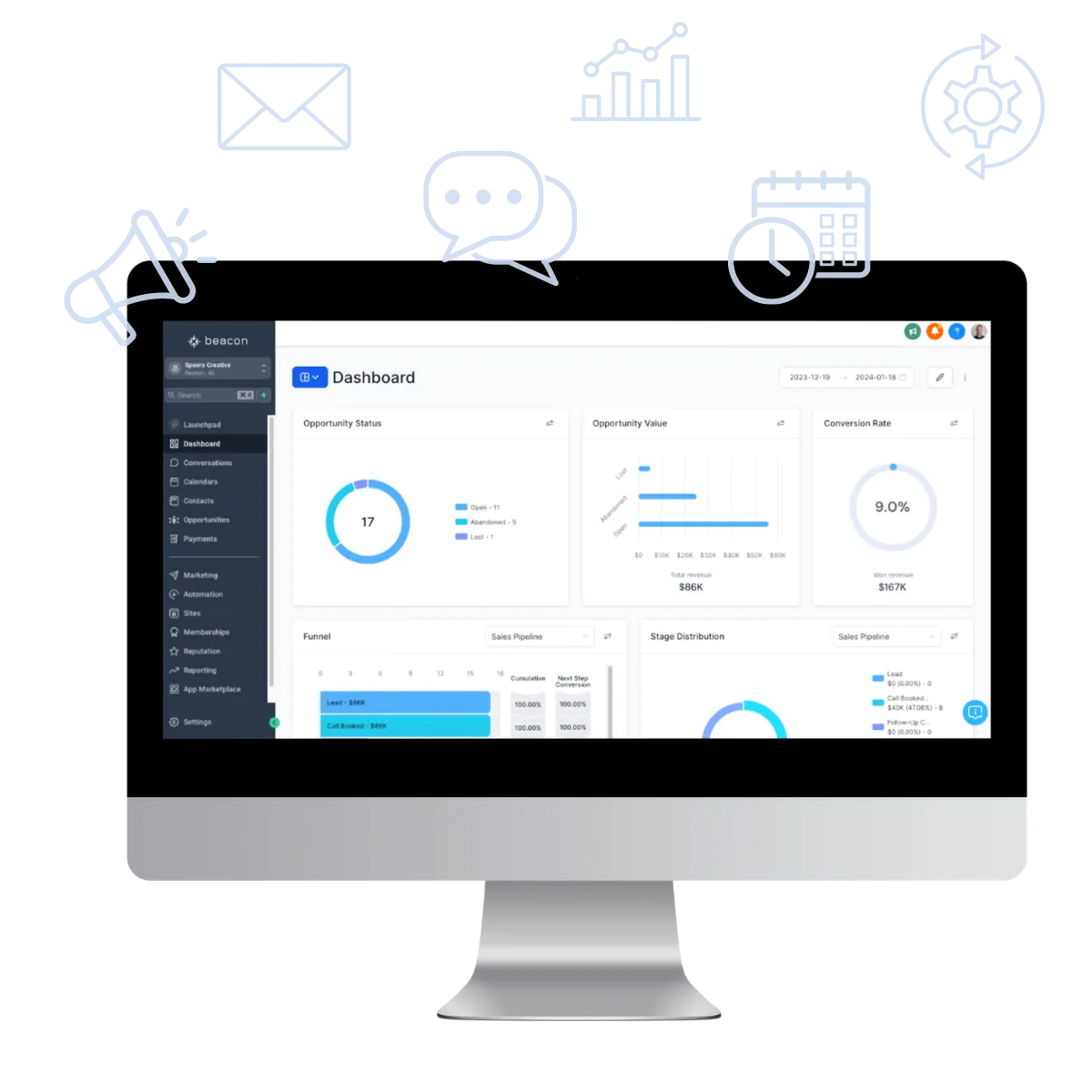 Build forms and funnel pages to capture leads, user automated sms, email, phone calls, voicemails, and Facebook Messages to nurture leads through custom pipelines, converse with leads & clients via text, phone, and Facebook Messenger (all in one stream!), and more!